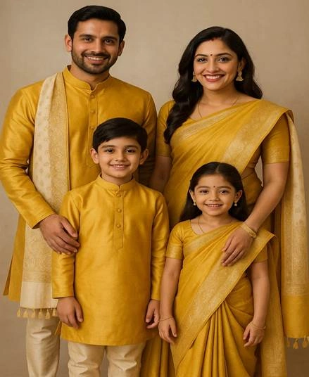 - Kurta-Pajama with Saree Combos: Dads in kurta sets, moms in elegant sarees, and kids in coordinated ethnic wear.