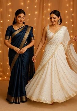 - A navy-blue silk saree setor a white lehenga saree is perfect for making a stylish yet traditional declaration.