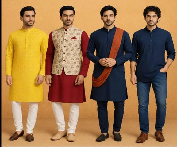 A: Men can wear kurta pajama sets, embroidered kotis, dhoti pants, or fusion Indo-western appearances for Garba.