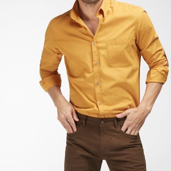 - Mustard yellow shirts match particularly well with chocolate brown trousers.